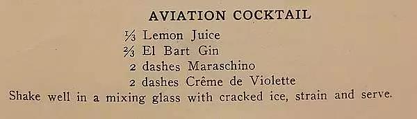 原來早在1916年出版的書中,就已經有了Aviation這杯調酒的酒譜,而且,里面居然有紫羅蘭酒這項材料!